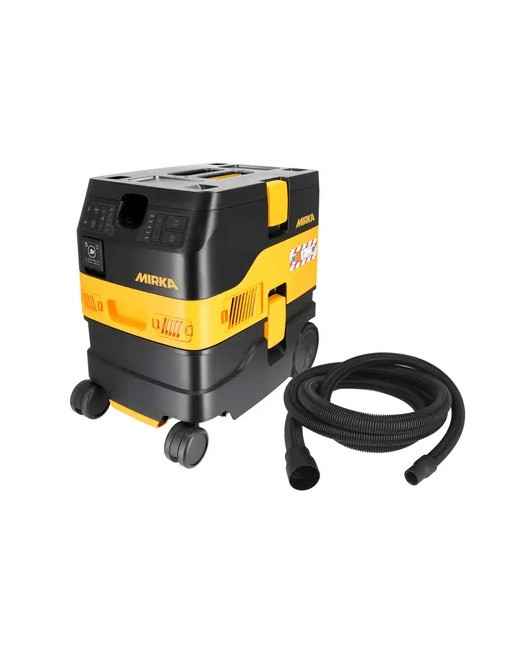 Aspirateur mobile Mirka compact de classe M, ergonomique et silencieux doté d'un moteur électrique sans charbons à longue durée de vie. Compatible avec le bracelet de télécommande portable pour commuter les fonctions et relayer les informations à l'opérateur.