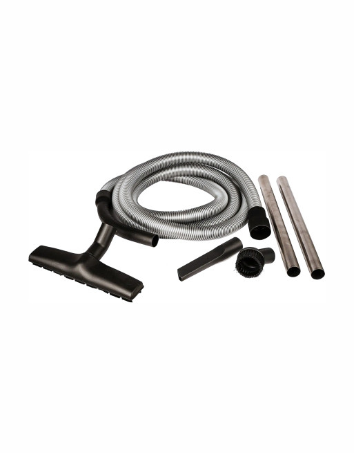 Kit de nettoyage pour aspirateur comprenant : 1 tuyau 34/40 mm (diamètre extérieur) x 4 m, 2 tubes en acier inoxydable, longueur 500 mm, 1 buse de sol, 1 tube avec embout brosse.