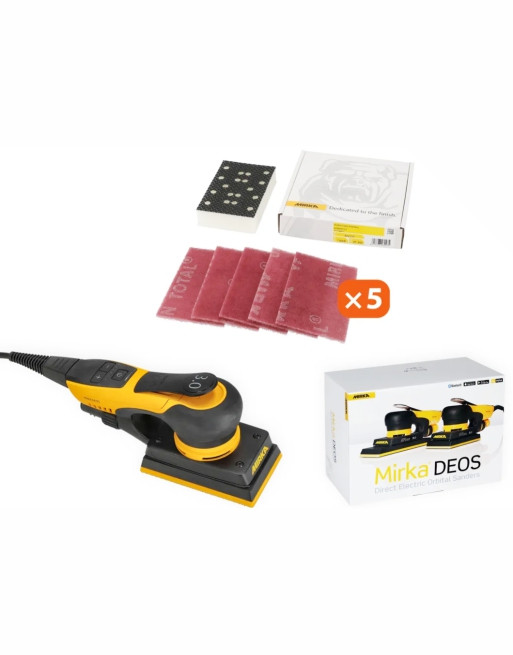 Conditionnement : 1 ponceuse Mirka DEOS 81 x 133 mm + 1 kit moulure (1 interface mousse auto-agrippante 81 x 133 x 25 mm + 5 coupes abrasives Mirlon Total VF 360)